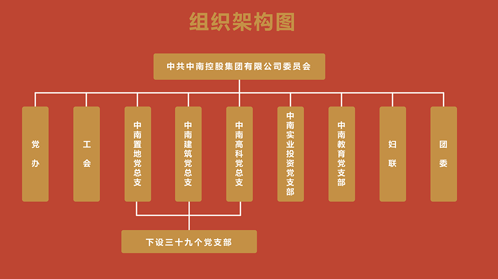 1988年,中共中南控股集團(tuán)有限公司黨支部成立,2002年升級為中共中南控股集團(tuán)有限公司黨總支,2007年6月,成立中共中南控股集團(tuán)有限公司委員會。目前公司黨委下設(shè)2個黨總支,39個黨支部,655名黨員。